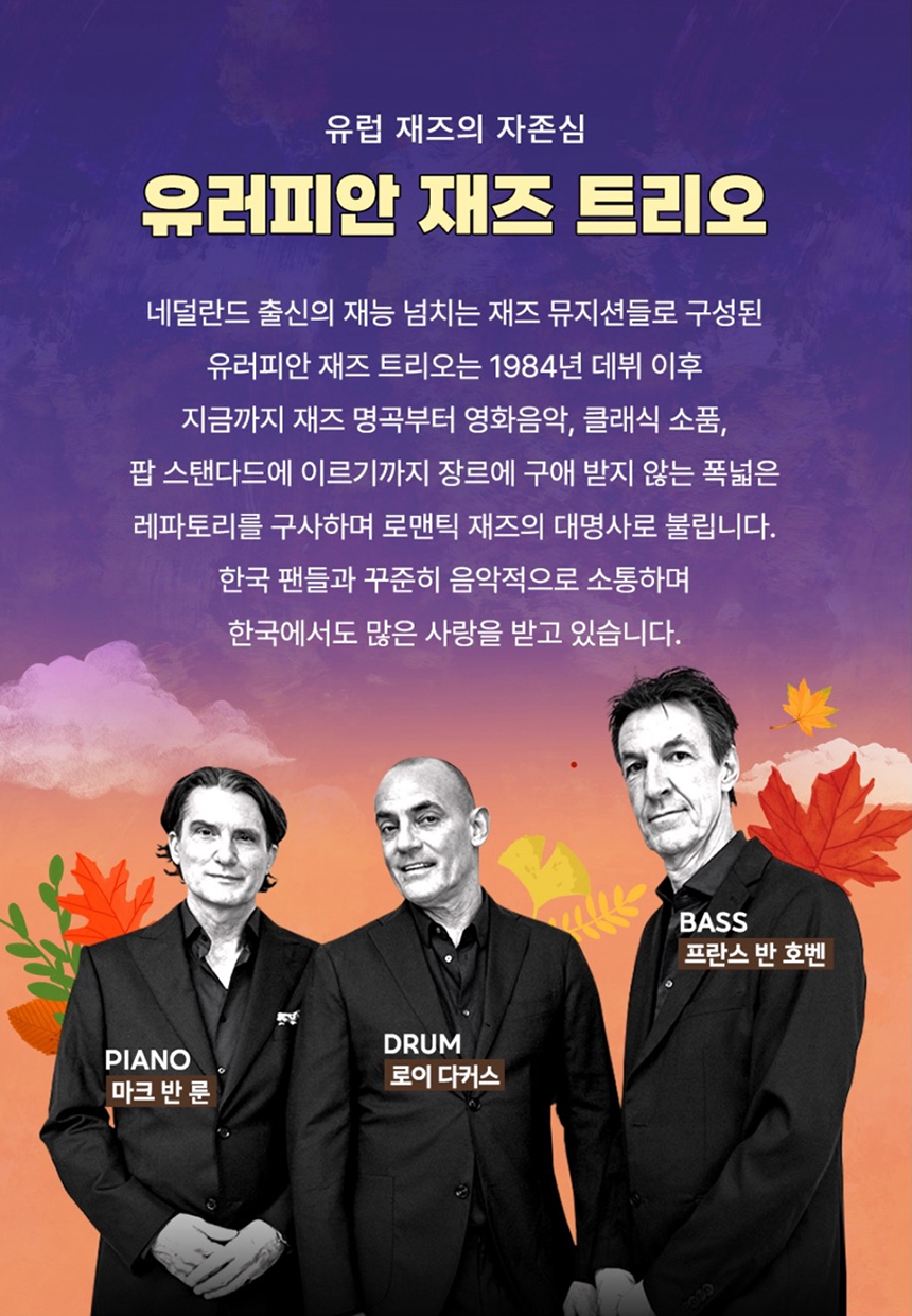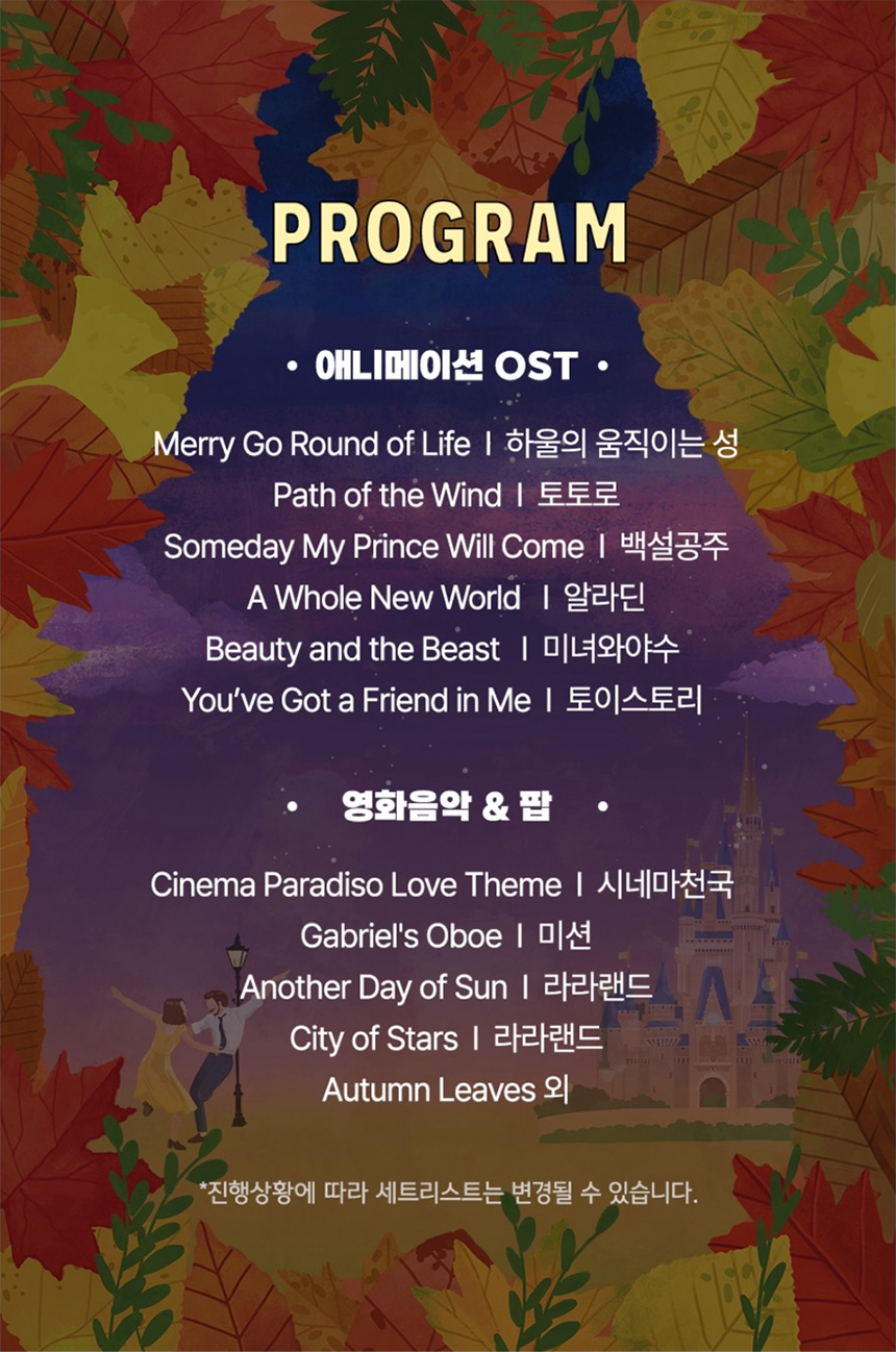 이번 공연은 애니메이션 OST 와 영화음악들을 유러피안 재즈 트리오의 아름다운 선율로 감상할 수 있습니다.